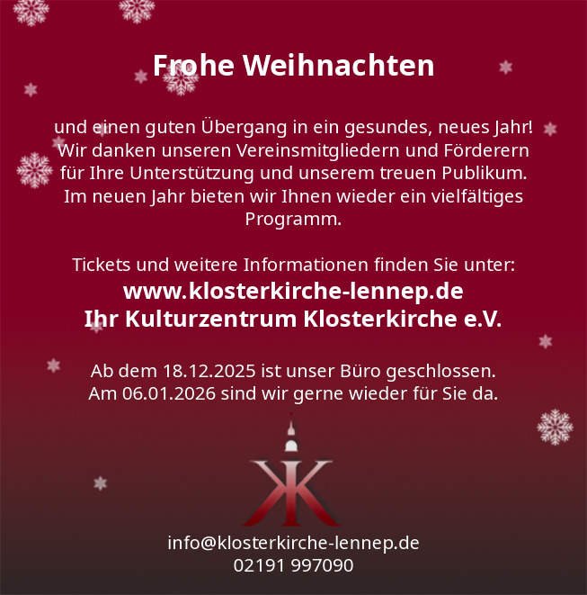 Unser regelmäßiger Newsletter hält Sie mit Neuigkeiten und interessanten Informationen zum Kulturzentrum Klosterkirche Lennep auf dem Laufenden. Bitte geben Sie zur Anmeldung Ihre E-Mail-Adresse ein.